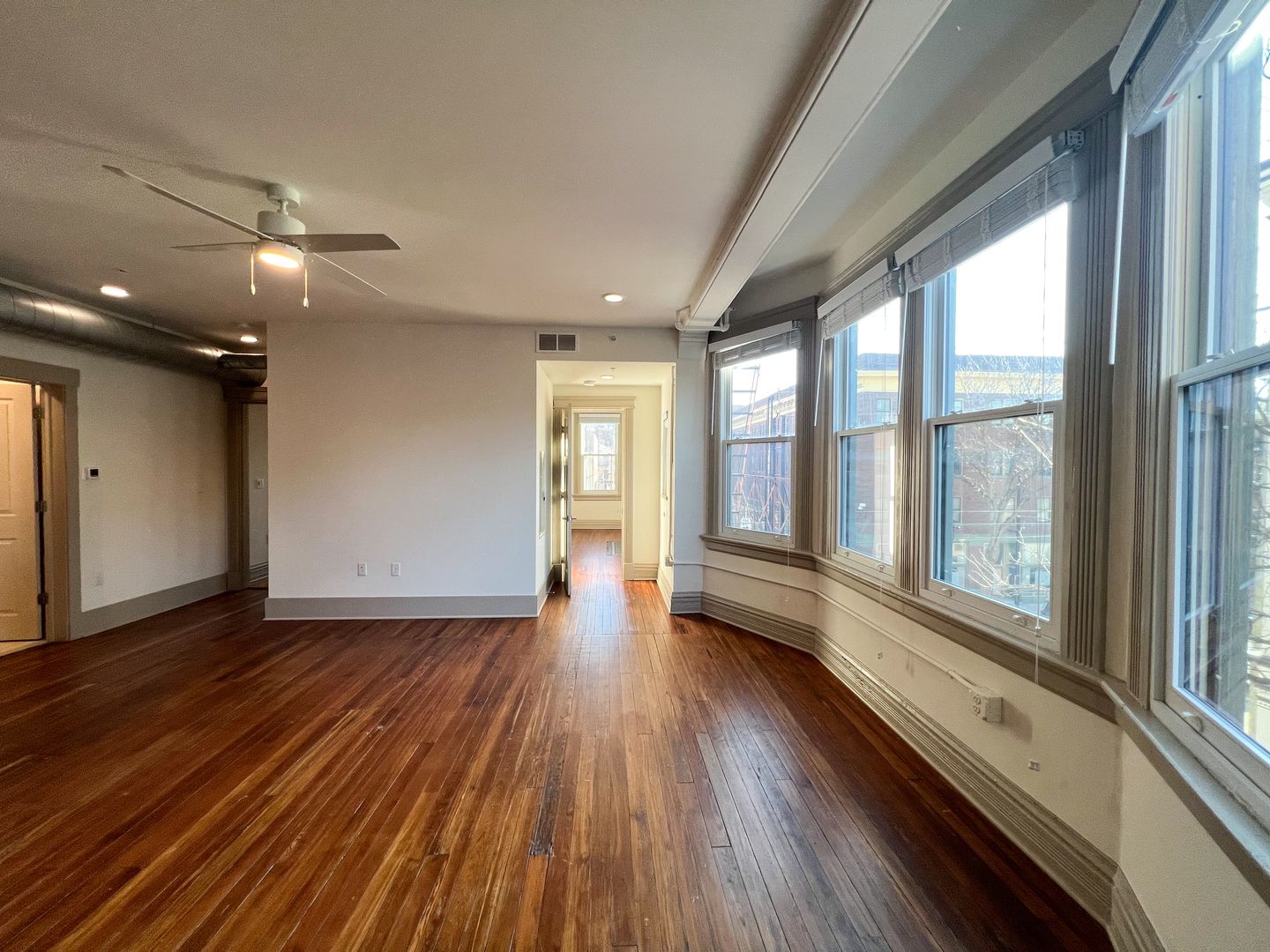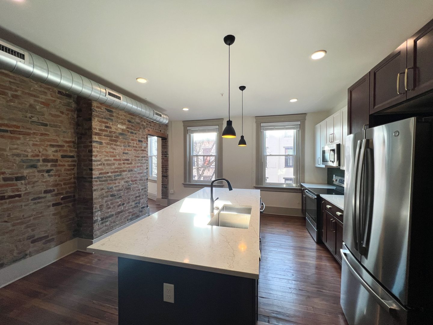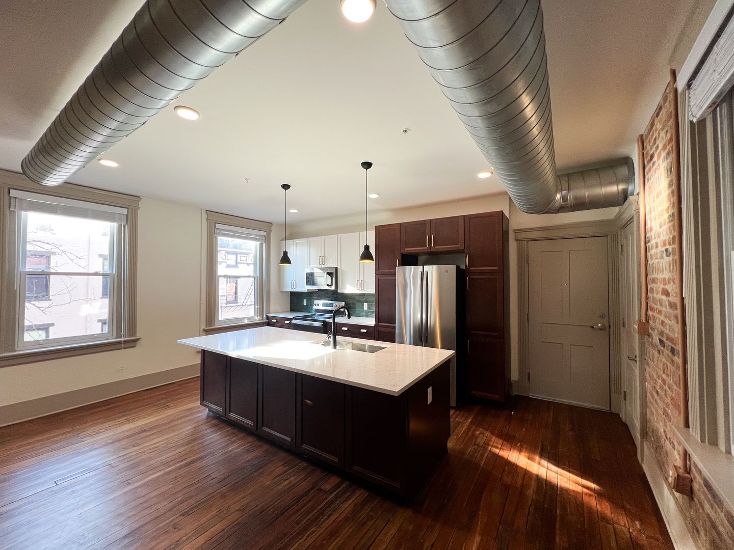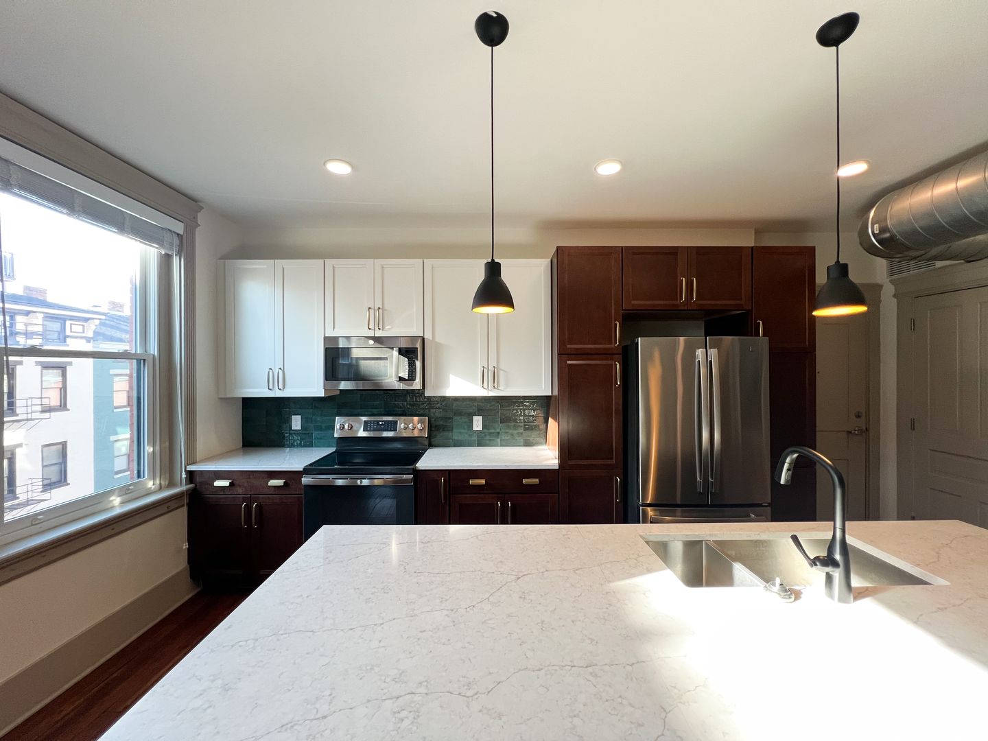 Upon entering the unit, you are greeted with hardwood floors, a perfect island for entertaining, gorgeous green backsplash and ample kitchen storage! Through the open doorway lies your living room with expansive bay windows. Both bedrooms overlook Race Street. Laundry room with linen storage.