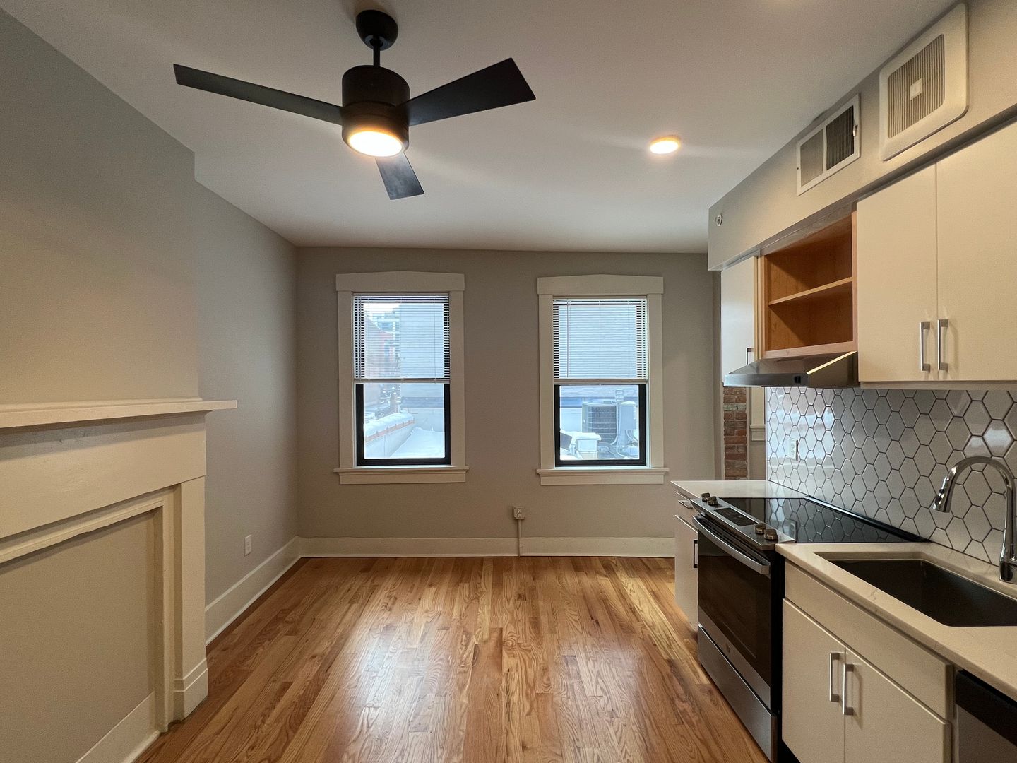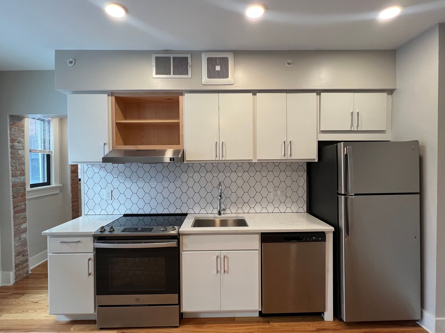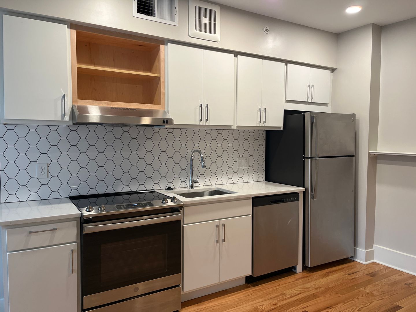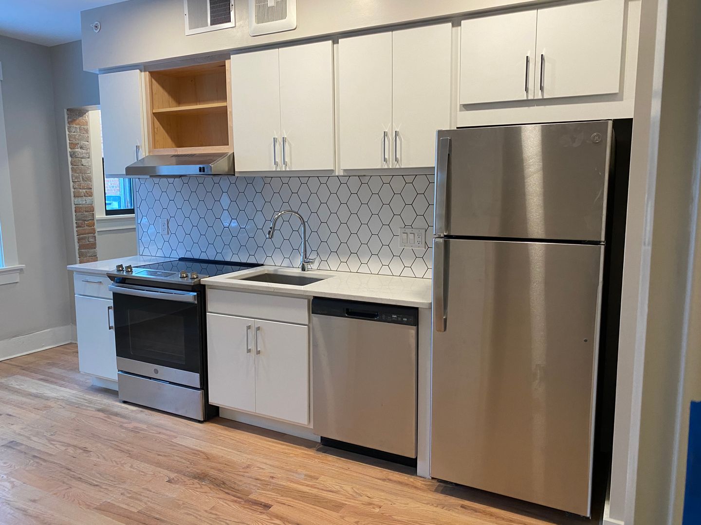 Inside, hardwood floors and natural light lead into a modern kitchen with GE stainless-steel appliances, quartz countertops, a hexagonal backsplash, and white cabinetry. Through the doorway on the right, you’ll find a large linen closet, the bedroom area, and a renovated bathroom with patterned tile, a subway-tiled shower, and an in-unit washer and dryer.
