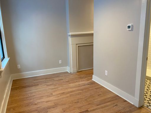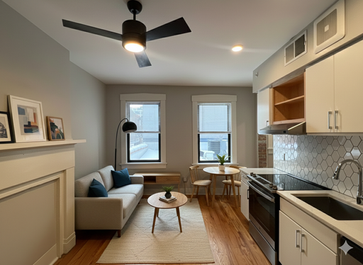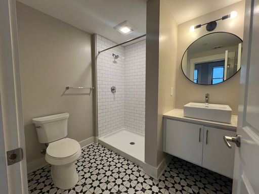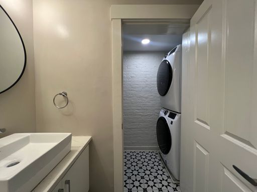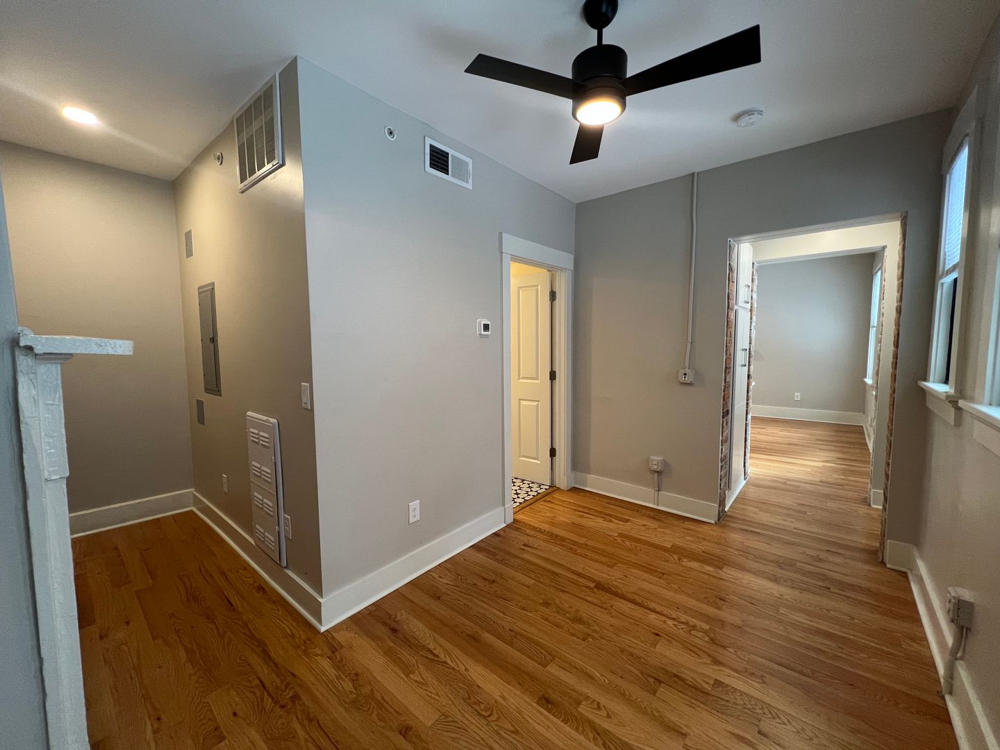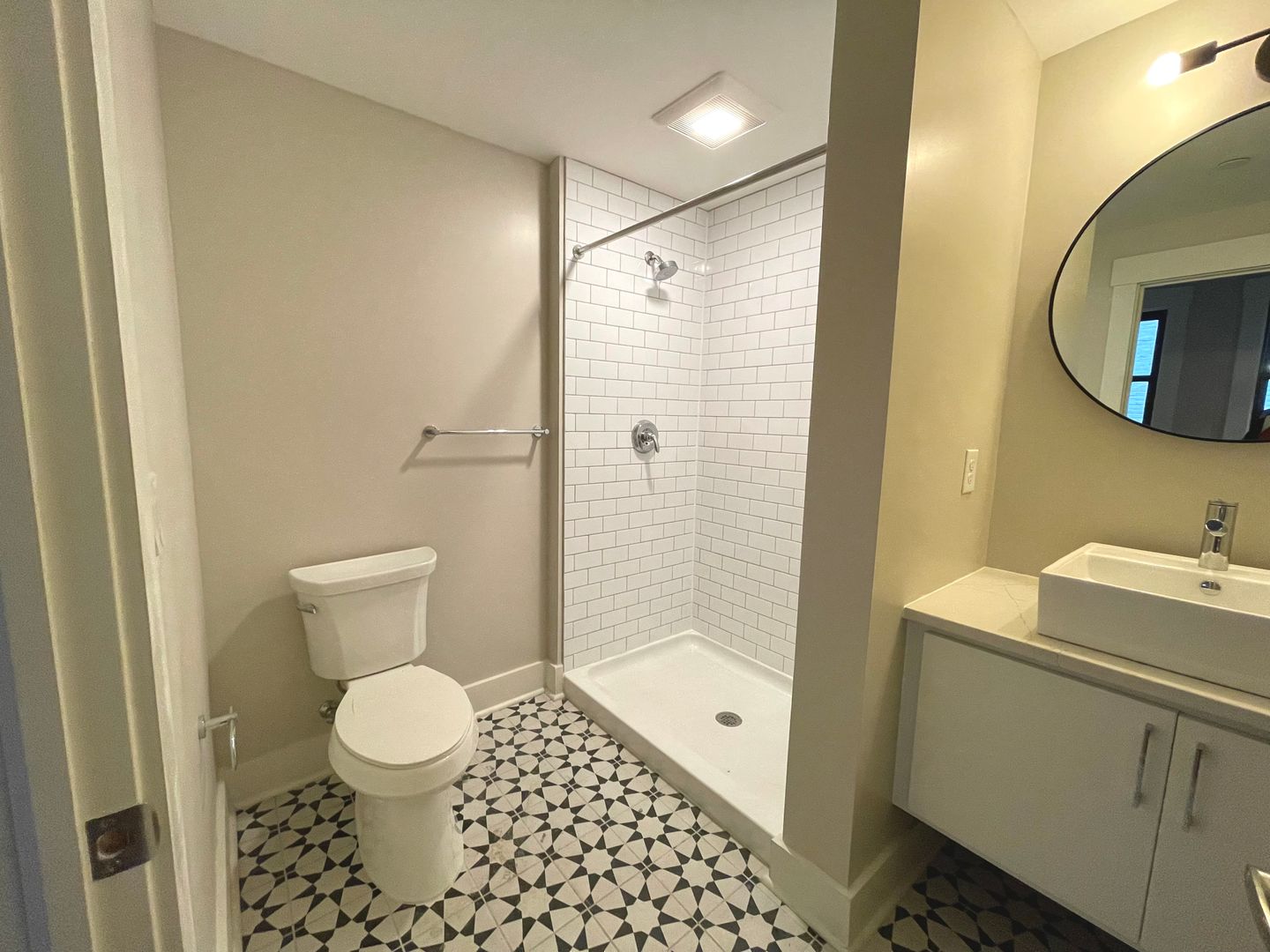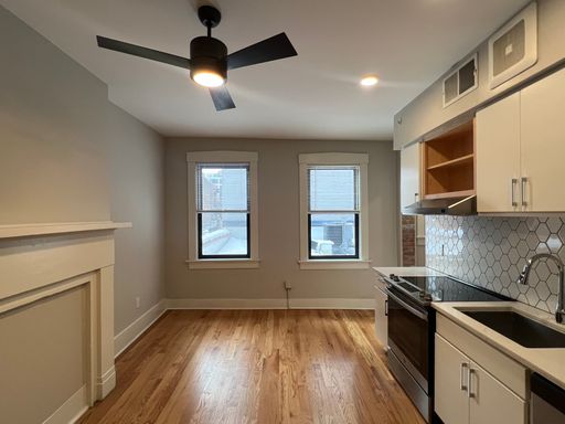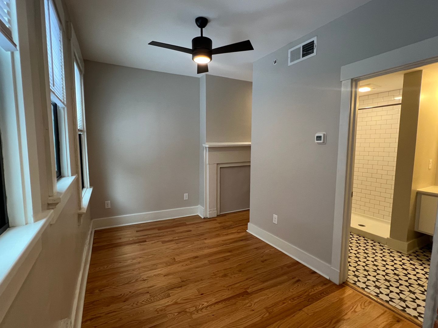 Inside, hardwood floors and natural light lead into a modern kitchen with GE stainless-steel appliances, quartz countertops, a hexagonal backsplash, and white cabinetry. Through the doorway on the right, you’ll find a large linen closet, the bedroom area, and a renovated bathroom with patterned tile, a subway-tiled shower, and an in-unit washer and dryer.