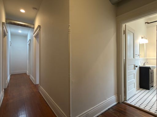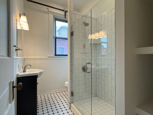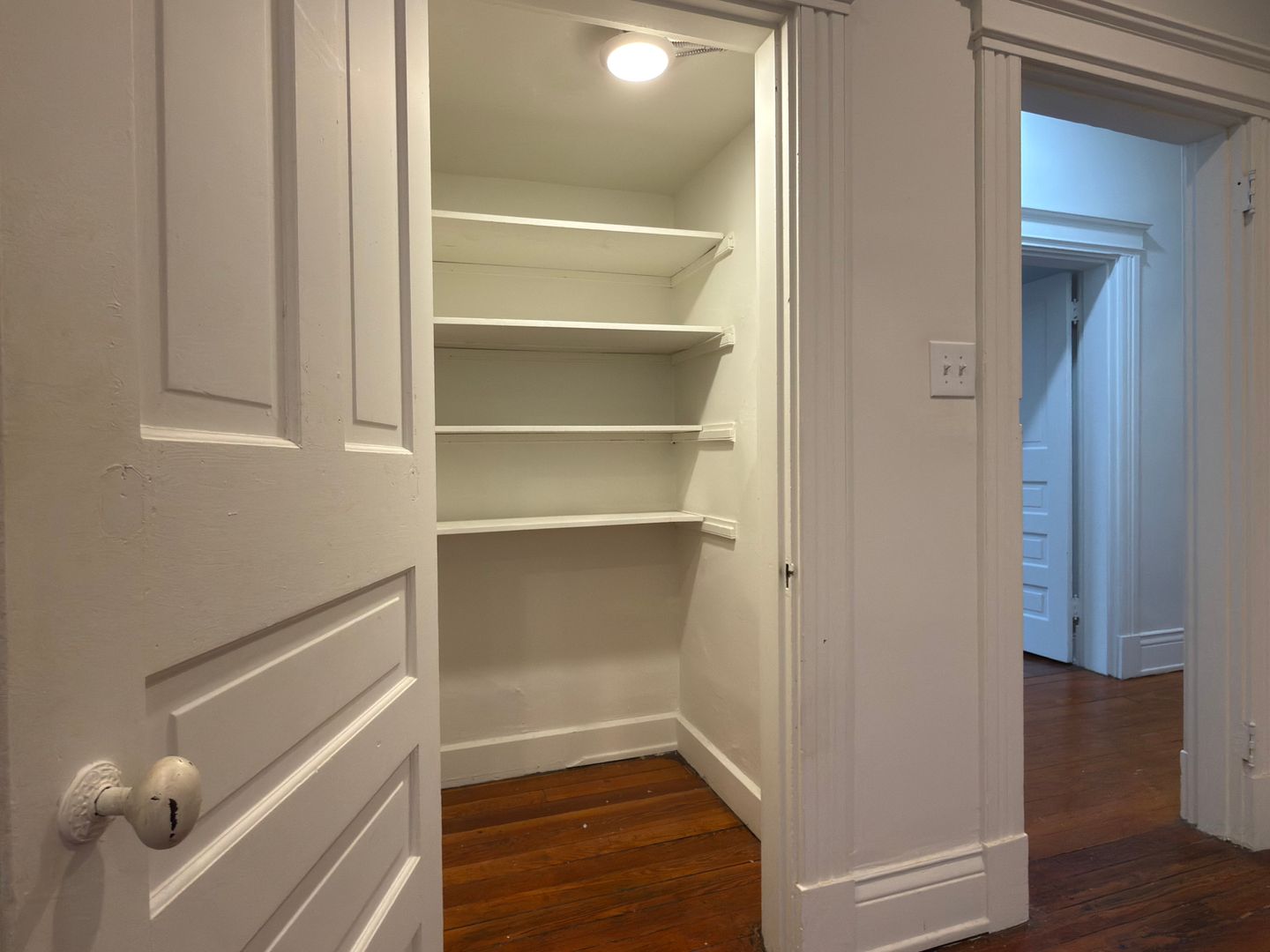 Updated bathrooms with subway tile and linen shelving. Freshly renovated kitchens with updated appliances, and quartz countertops and large pantry. Spacious floor plans with original pocket doors could create a flex room for an office or additional bedroom.