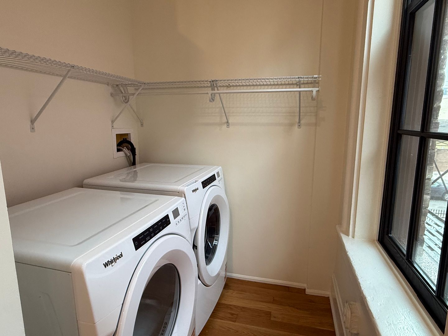 The kitchen is on the first floor offering exposed brick, stainless steel appliances including a new dishwasher, a stainless steel backsplash and storage racks. The dining and living area is just off the kitchen showcasing a vintage fireplace mantel, huge windows, built-in bookshelves and tall ceilings that would be perfect for large works of art. In unit laundry.