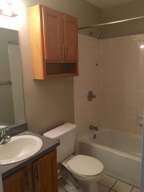 Beyond the kitchen with ample cabinet space to the right, is your bathroom with updated fixtures.