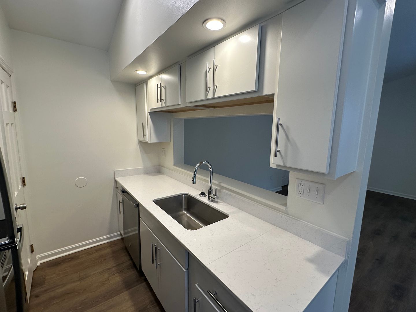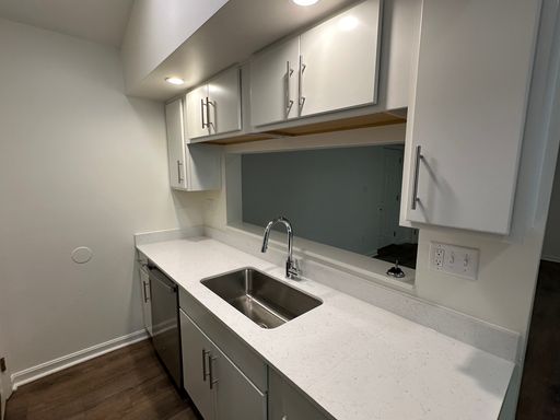 The apartment features a practical layout with two entryways: the main front door and a convenient side door near the kitchen, which offers direct access to parking. Inside, you'll enjoy sleek hardwood floors and a modern kitchen outfitted with stylish fixtures, perfect for both everyday dining and entertaining.