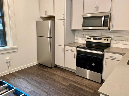 Unit 201 is a second floor, 2 bedroom, 1 bathroom unit. As you walk into the unit you are lead down a hall that opens up into the unit. There is an open kitchen where you will see stainless steel appliances including refrigerator, dishwasher, stove and microwave, as well as quartz countertops. The kitchen opens up into a spacious living area with large, bright windows.