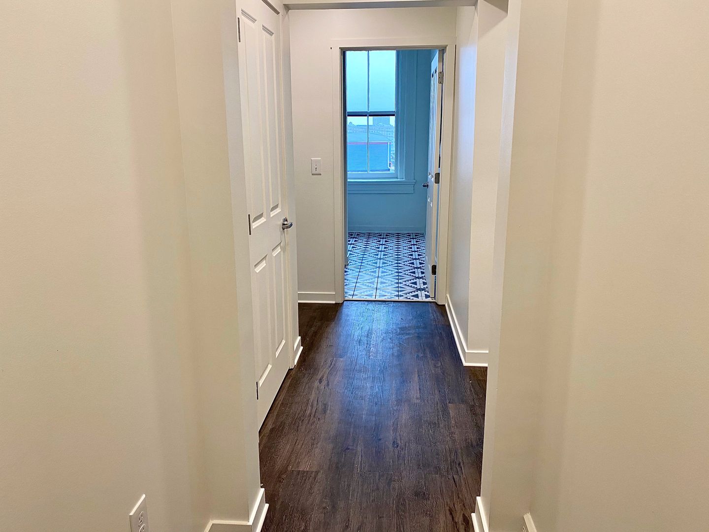 The bathroom has a stand-up shower lined with subway tile and quartz countertop vanity. You will find the in-unit washer and dryer tucked into double-door closet in the second hall. Both bedrooms boast large windows and closets.