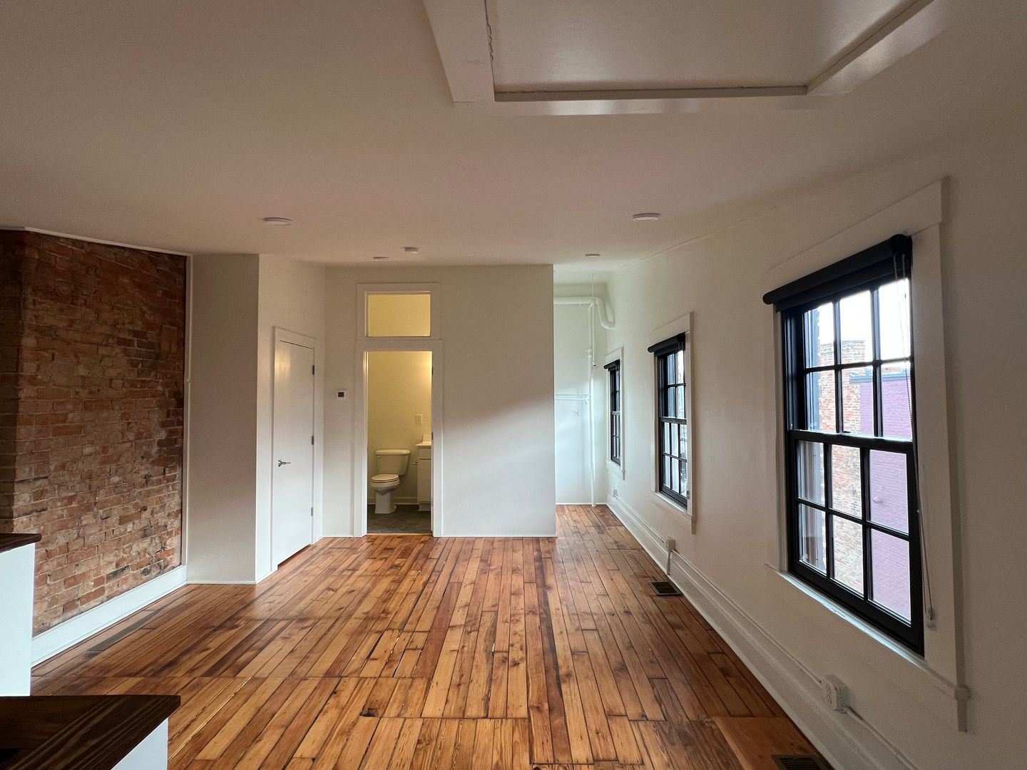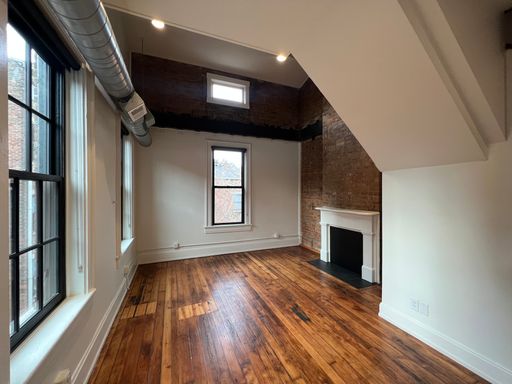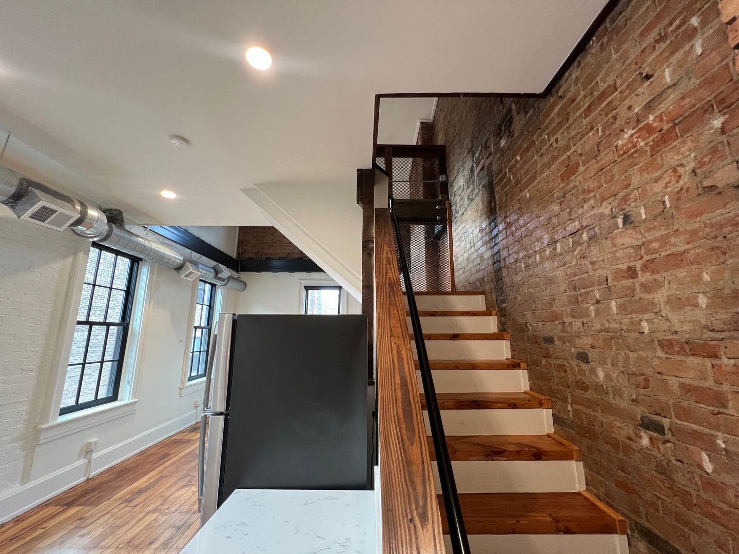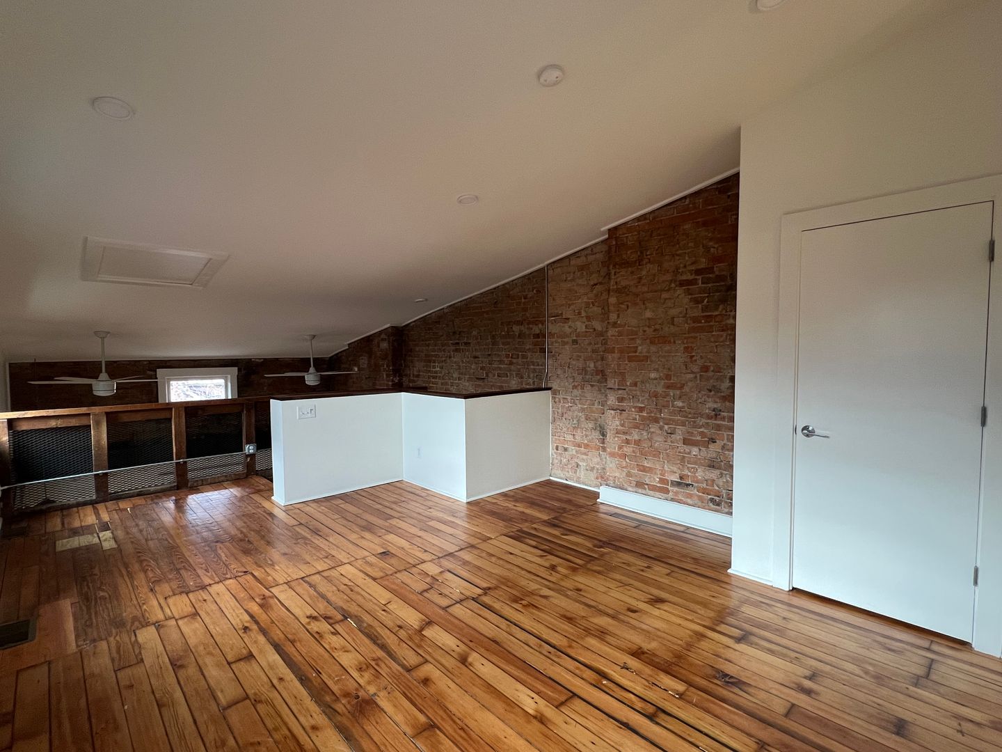 Loft D is on the top floor of 1443 Walnut Street. This 2-story, 1-bedroom/1-bathroom loft features exposed brick and beams, hardwood floors, and a bright open layout with classic industrial charm.