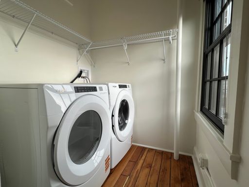 Upstairs, the bedroom overlooks the living space and includes a renovated bathroom with a stand-up shower and glass doors, along with an in-unit washer and dryer for added convenience. Central heat and air keep the space comfortable year-round.