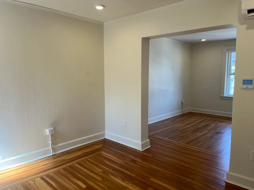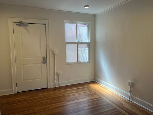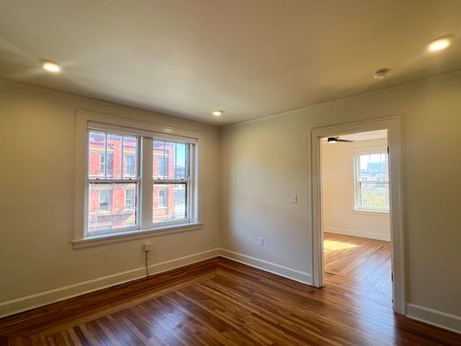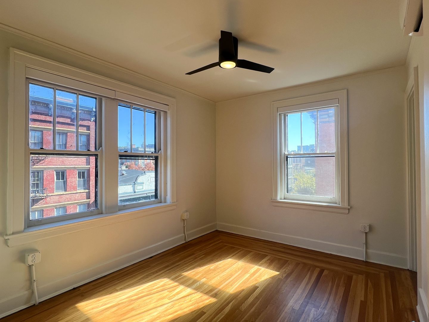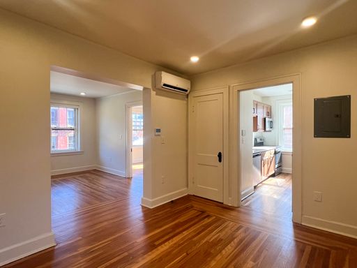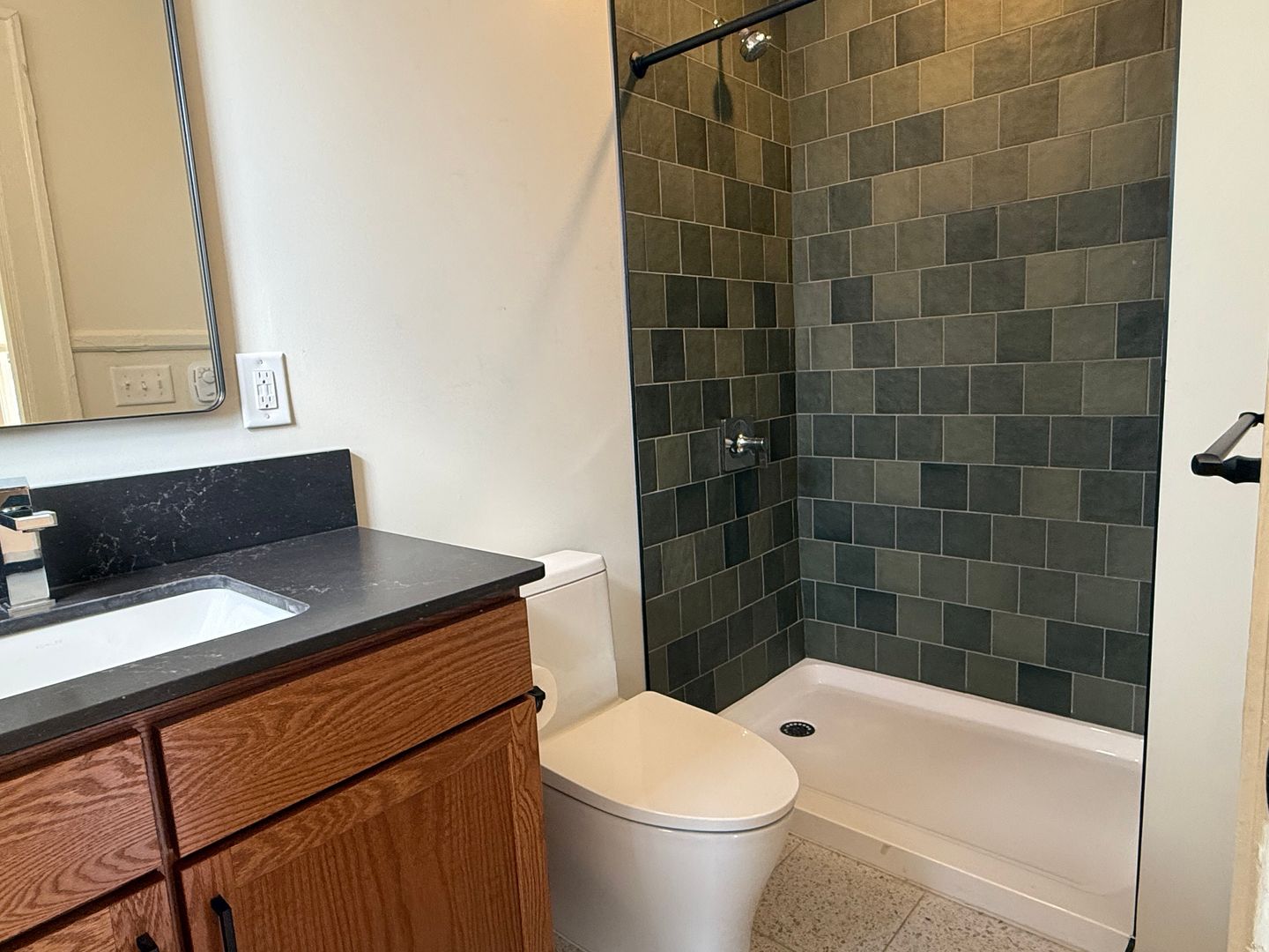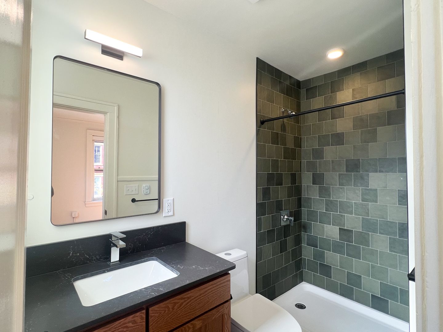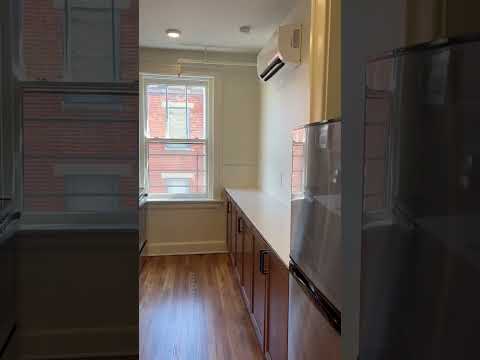 Inside, the apartment features beautiful hardwood floors, sleek quartz countertops, and stainless steel appliances. The open living space is filled with natural light, and the newly updated bathroom offers modern style with a green tiled shower and contemporary vanities. Common laundry is available on the first floor for added convenience.