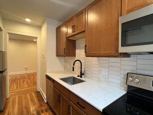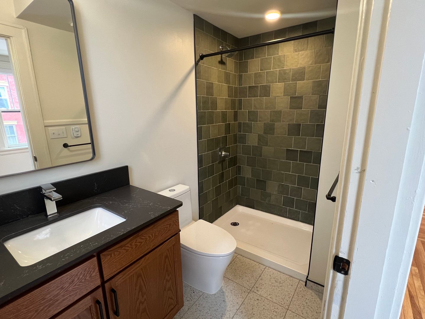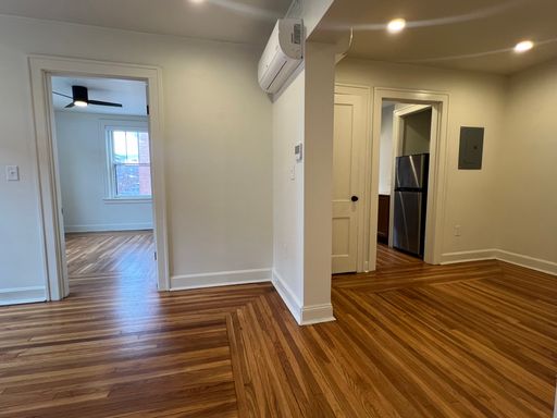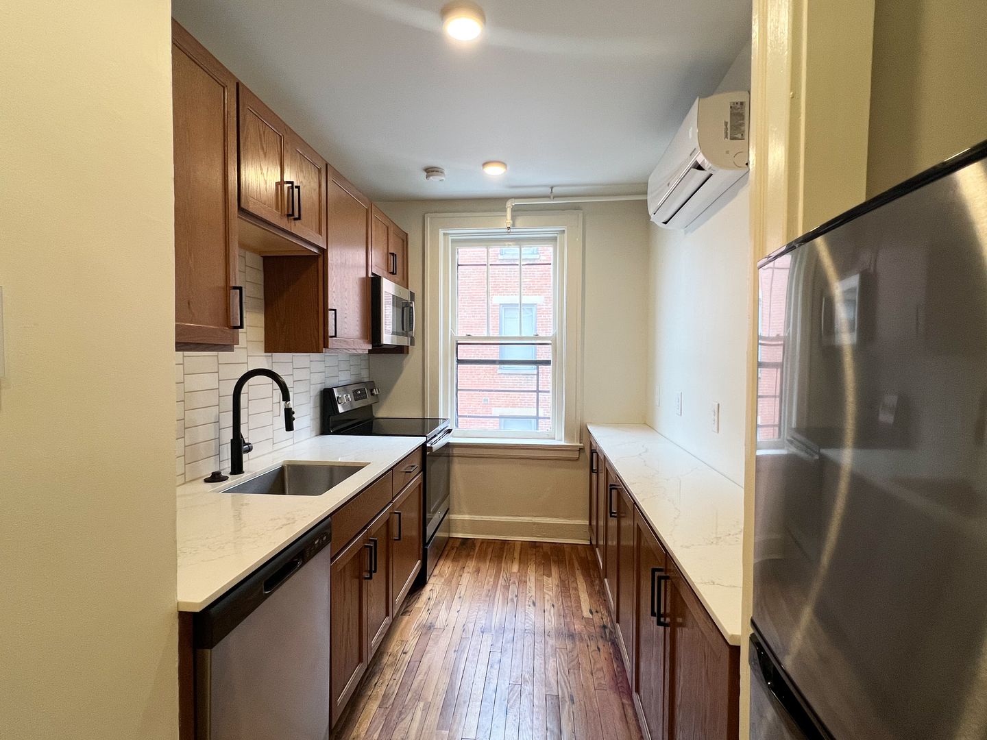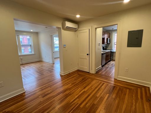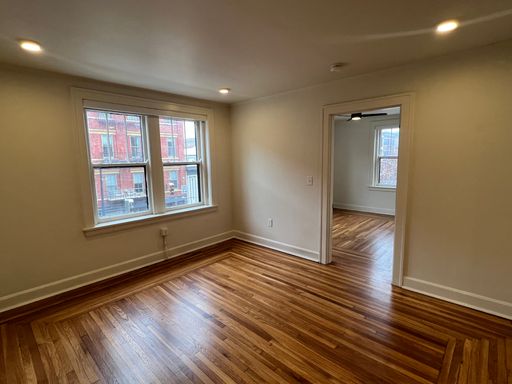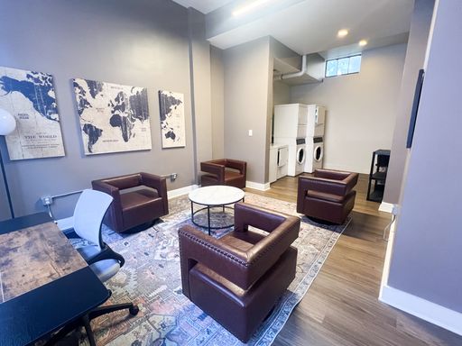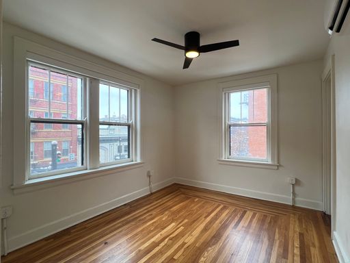 Upon entering the unit, you are greeted with hardwood floors, ample quartz countertops, and a living space flooded with light. The newly renovated bathrooms features green tiled showers and new vanities. Common laundry on first floor.