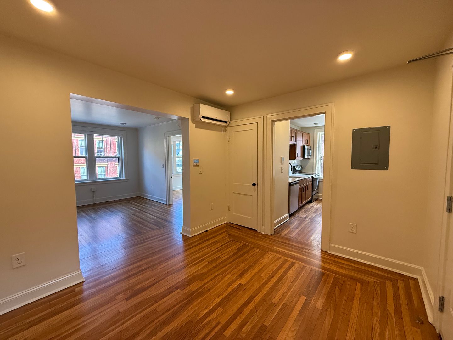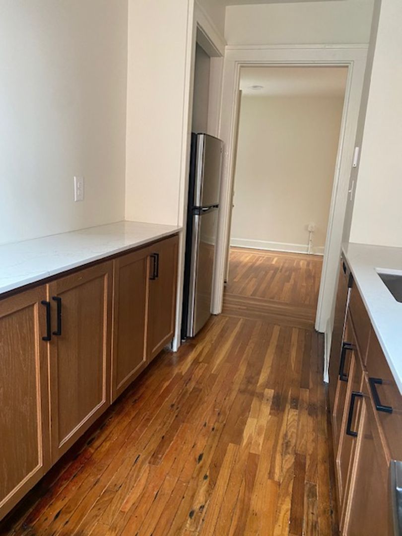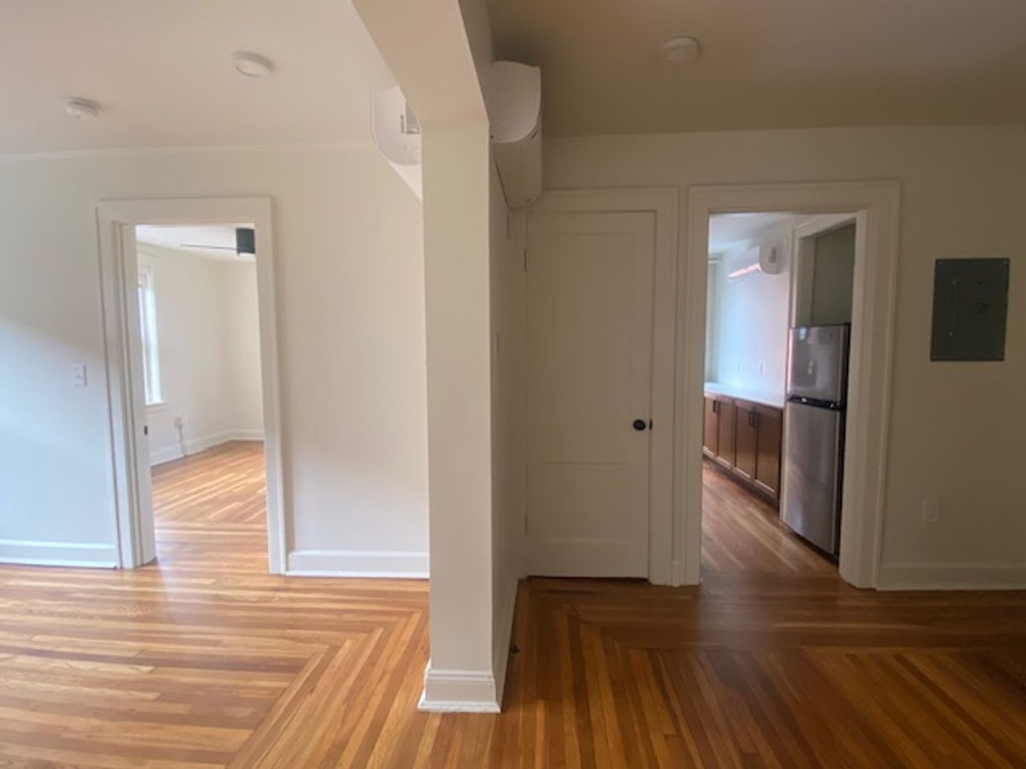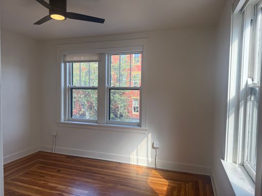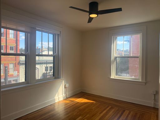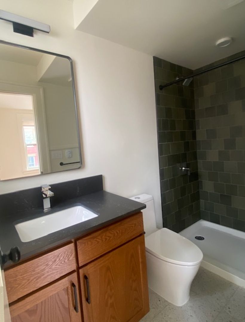 Upon entering the unit, you are greeted with hardwood floors, quartz countertops and living space flooded with light. The newly renovated bathrooms features green tiled showers and new vanities. Common laundry on first floor.